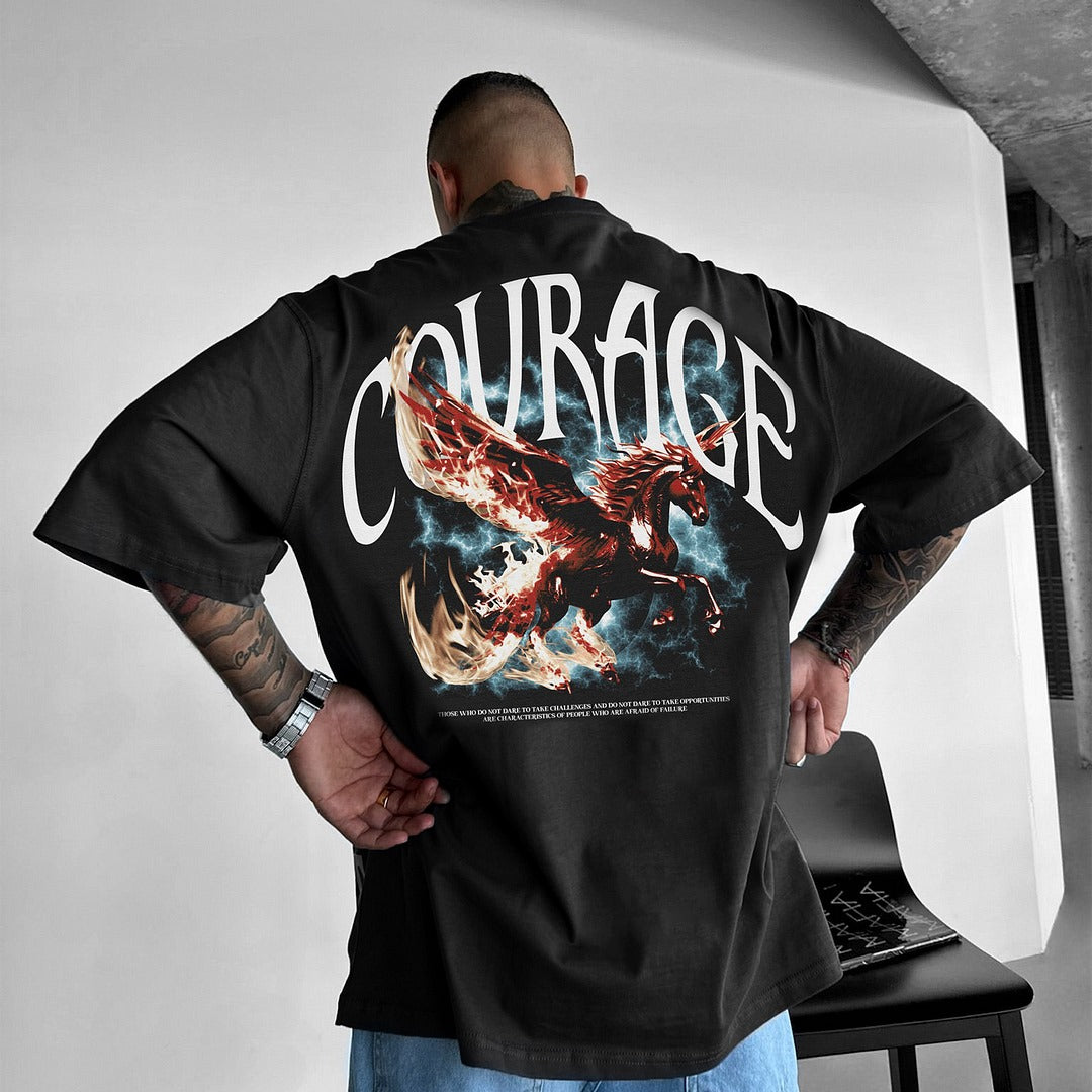 Destaca con estilo y actitud con esta camiseta oversize negra, diseñada con un imponente estampado de un Pegaso en llamas acompañado de la palabra “COURAGE” en la espalda. Su diseño artístico transmite fuerza, poder y valentía, convirtiéndola en la prenda ideal para quienes buscan un look urbano, moderno y lleno de personalidad. Confeccionada en tela suave y resistente, garantiza comodidad y frescura en tu día a día.
