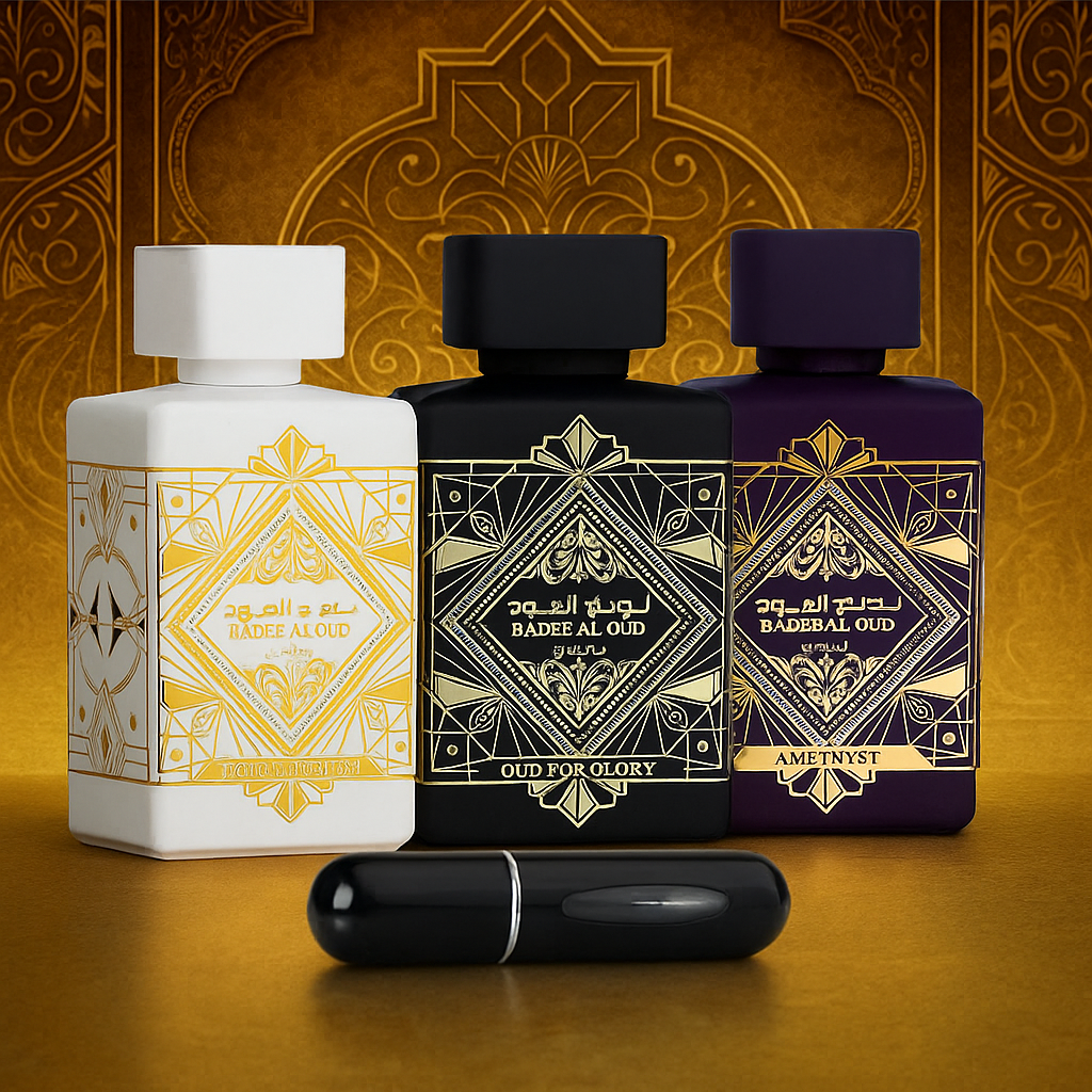 Bade’e Al Oud de Lattafa es una colección de fragancias exclusivas que fusiona elegancia, lujo y sofisticación en cada gota. Presentada en tres versiones únicas —Honor & Glory, Oud for Glory y Amethyst— cada una ofrece una experiencia olfativa distinta, elaborada con ingredientes de alta calidad y acordes intensos que evocan la tradición árabe del oud.