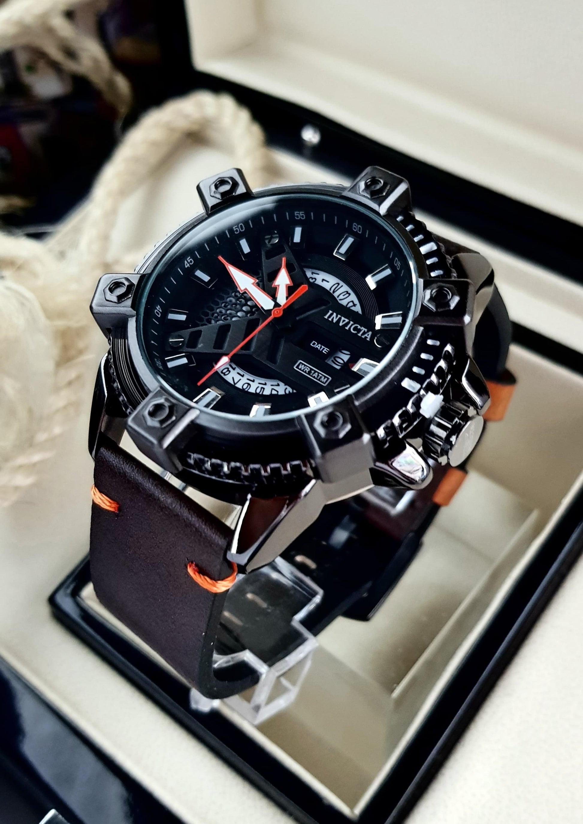 Reloj Invicta de diseño robusto y elegante, ideal para quienes buscan estilo y resistencia. Su caja en cuero maneja un alto nivel de elegancia, que le otorga un aspecto industrial y moderno. La carátula negra combina indicadores dorados y manecillas en tono naranja con detalles luminosos, asegurando una excelente legibilidad. Incluye función de fecha y un diseño multifuncional que destaca por su precisión. La correa de cuero marrón claro/ negro / café o azul con costuras reforzadas añade un toque clásico que contrasta perfectamente con la estética deportiva del reloj. Resistente al agua hasta 10 ATM, es perfecto para uso diario o actividades al aire libre.